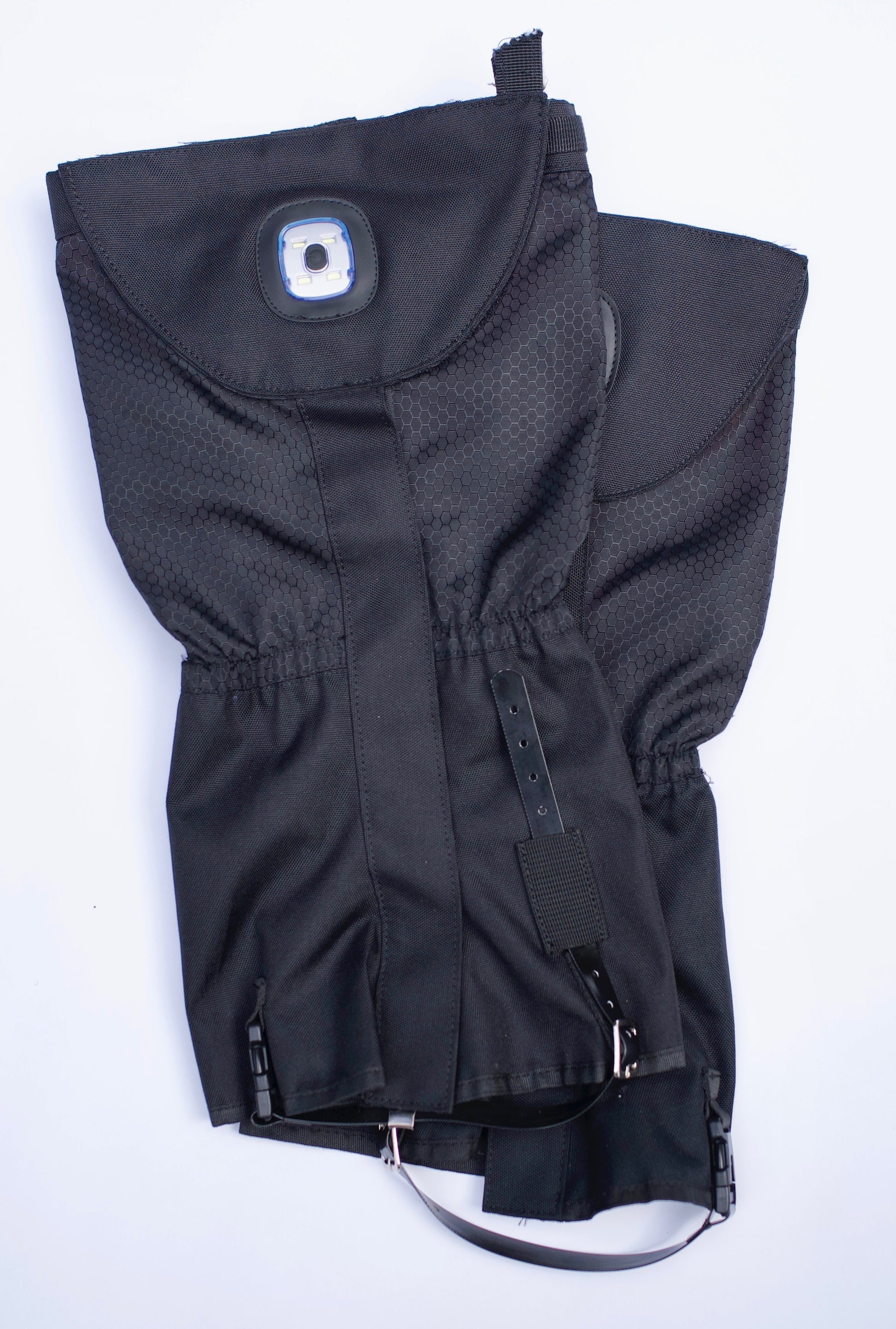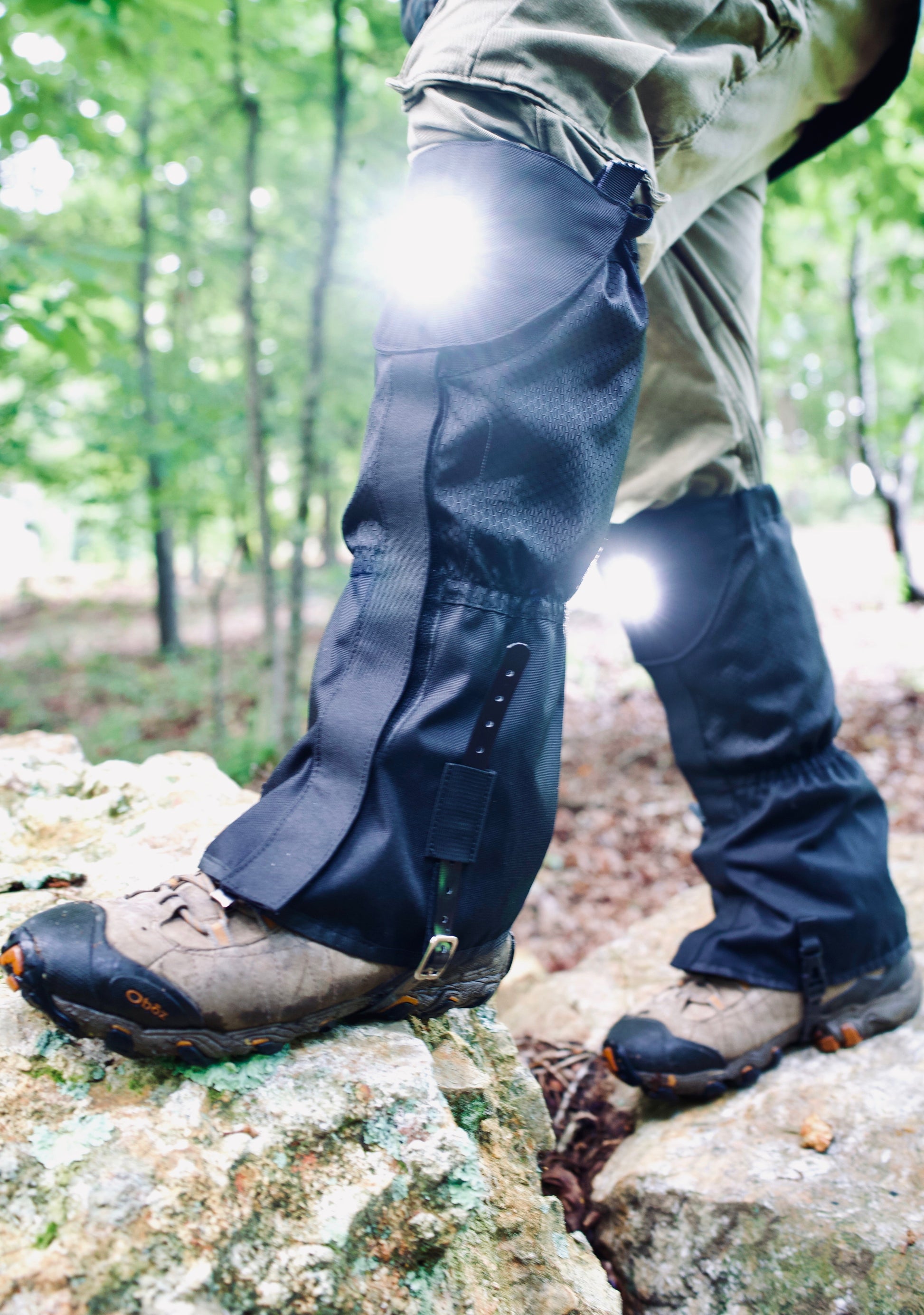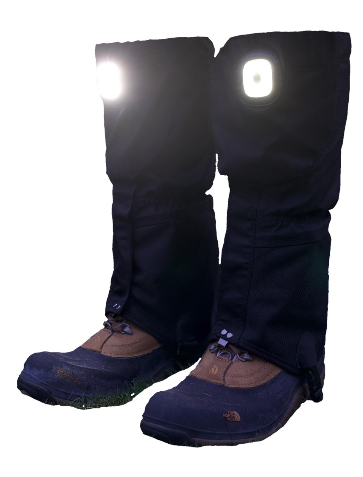 Introducing the Patented Trailblazer Gaiters! These novel "lighted" leg gaiters will not only protect you from snow, water, briars and prickly pears from entering your boots and soaking your pant leg but are also designed with rechargeable LED lights. A simple push button will turn the light on and off providing you with exceptional ground level lighting on even the darkest of nights! Perfect for the early morning or late evening trail hike. Hunters will especially find these gators useful before sunrise or after sunset during the trek to and from the tree stand. Tracking blood trails and field dressing your game at night just got a whole lot easier! Elk hunters boning out game will immediately "SEE" the benefits of additional ground level lighting. Useful beyond measure, the bright lights turn the gaiters into advanced safety gear for all who work in the outdoors. From workers in conservation and forestry to postal workers and snow removal companies - all will find that outfitting your members with a pair of Night Hawk Illuminated Gaiters will greatly enhance low light working conditions, providing additional safety while on the job.