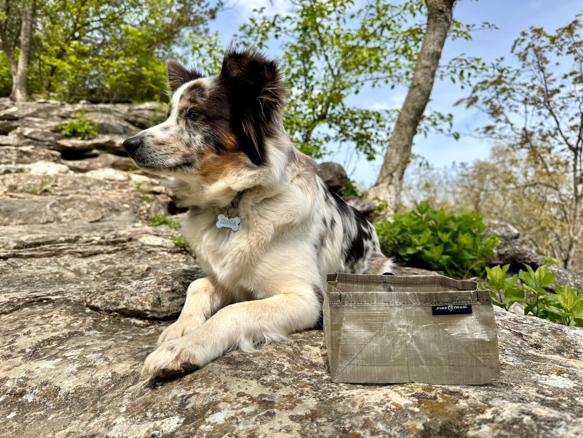 Introducing the Pike Trail Dog Bowl! Crafted from Dyneema "the world's strongest fiber." Handcrafted in Columbia, MO by our seamstress artisans! We designed this bowl for the adventurers, dog trainers, and ultralight enthusiasts. For dogs who live for the climb, the trail, and the unknown. Featherlight, Watertight, Bombproof and Trail-tested. Each bowl weighs less than a 1/2 ounce - can be folded up and put in your pant pocket, backpack, or attached to the leash (your dog won't even know it's there)!! 2 colors and size options to choose from. Say goodbye to your standard, clunky, rubber dog bowl and hello to the ultralight, foldable Pike Trail Dog Bowl!! Your pooch will thank you!