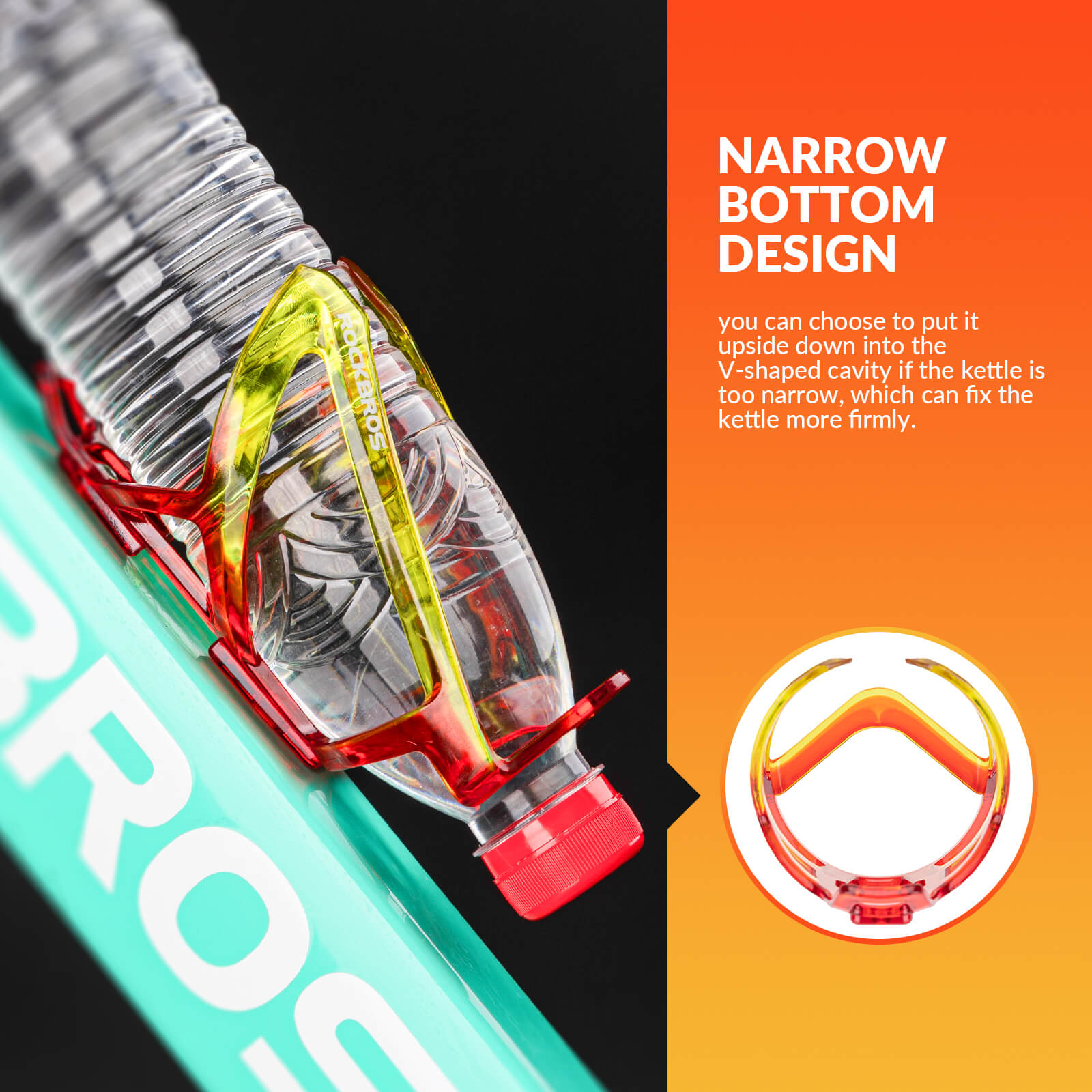 The plastic base of the water bottle cage fits snugly against the bike frame, reducing wear and tear. Lightweight yet sturdy, it ensures bottles stay secure while allowing easy access. Installation is simple with the included screws. -