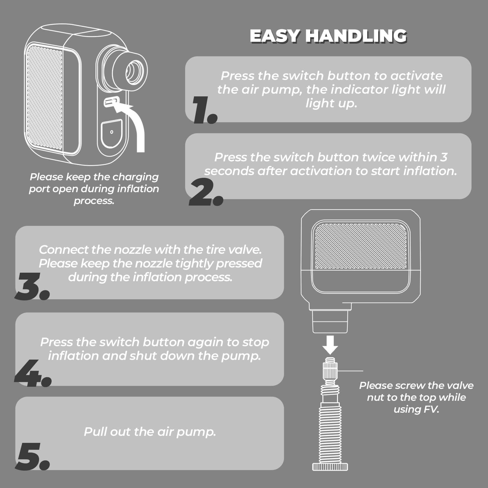 - Easy Operation : Simply follow the user manual instructions, press a few buttons, and the pump does the rest. With its intelligent pressure sensor system, it automatically detects tire pressure and stops inflating to prevent overpressure damage.
